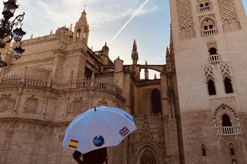 - Plaza Virgen de los Reyes, frente a la Catedral y la Giralda. El guía te estará esperando junto a la fuente con un paraguas blanco.